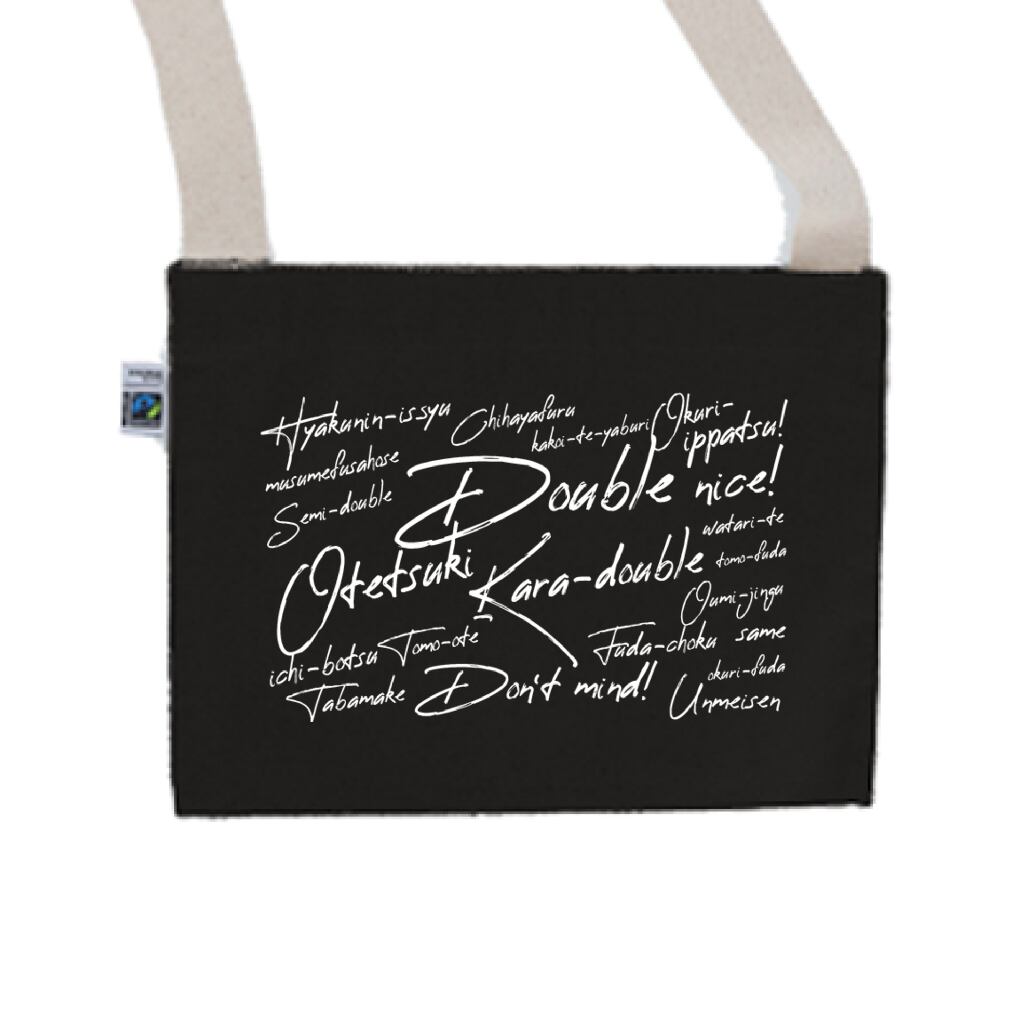国際フェアトレード認証ラベル付きの地球にやさしいサコッシュに競技かるたプレイヤーにはお馴染みの競技かるた用語をデザイン。