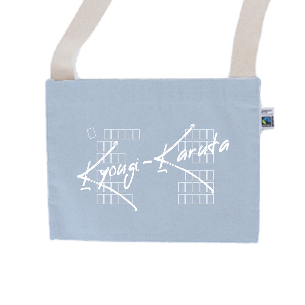 国際フェアトレード認証ラベル付きの地球にやさしいサコッシュに競技かるたプレイヤーにはお馴染みの競技かるた用語をデザイン。